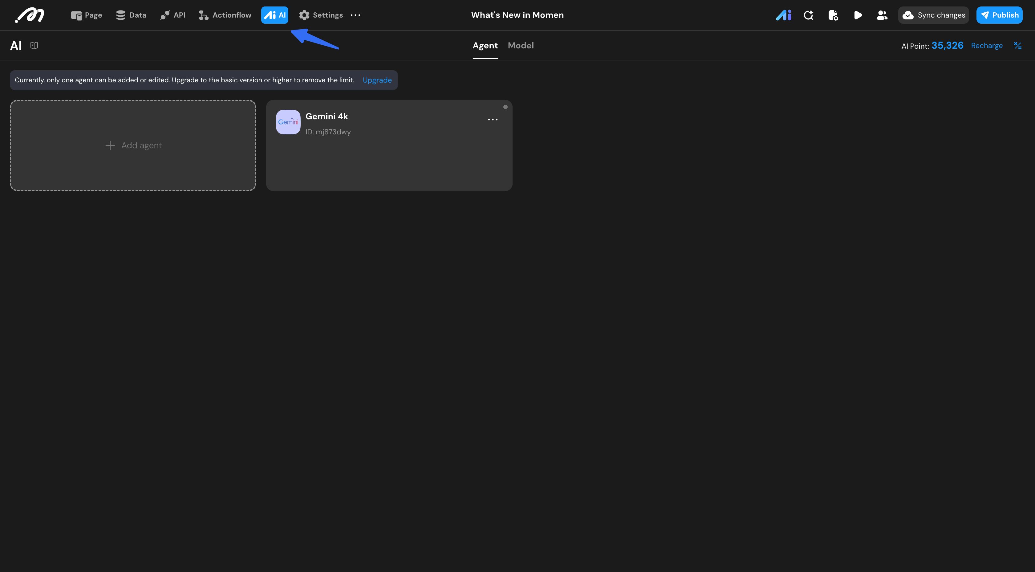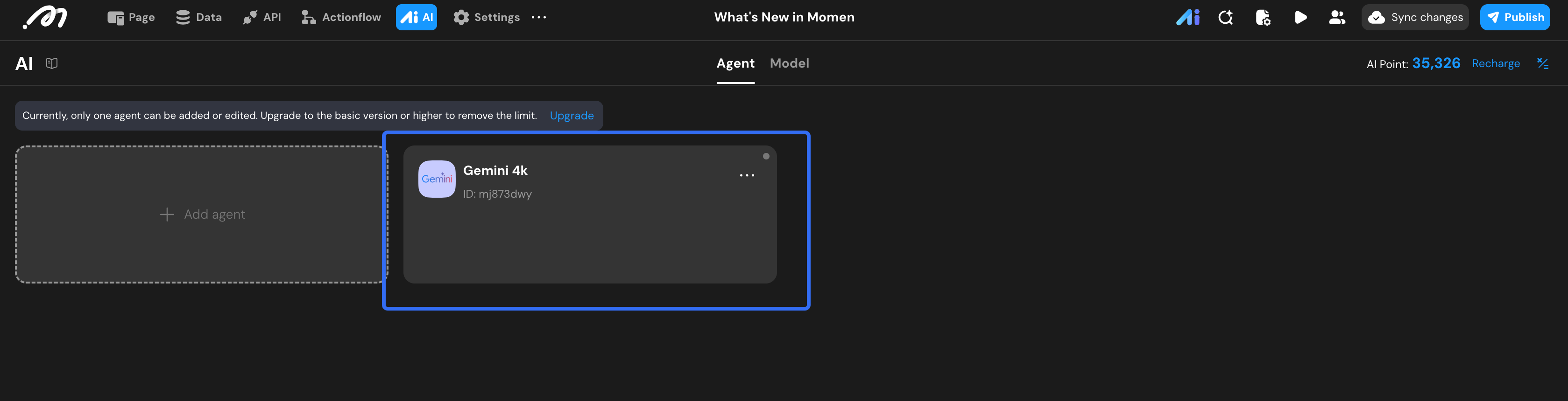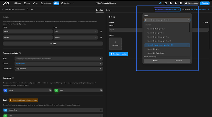 - In the Agent Editor, select Gemini-3-pro-image-preview-2K or 4K from the model menu in the upper-right cornerThe model is pre-integrated in Momen — no configuration needed.