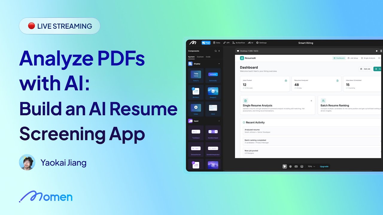 This livestream shows you how to automate one of the most tedious tasks in recruiting: screening resumes. We use Momen to build a backend that reads PDF resumes, extracts key details, and scores candidates against a job description automatically.