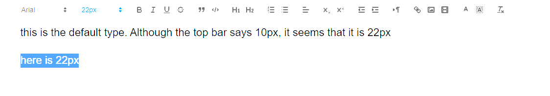 The default font size in my rich text editor displays 10px but letters I type appear to be 22px. I wondering if I am doing something wrong as far as settings or something.