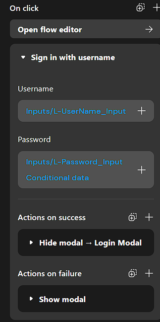 I thought maybe using conditionals on the Username and Password inputs (since it seems like you have to have a value to check against database to verify the existence of the user) but I am not seeing the logic necessary to do that once you click on the “+” on the right side of the input.
