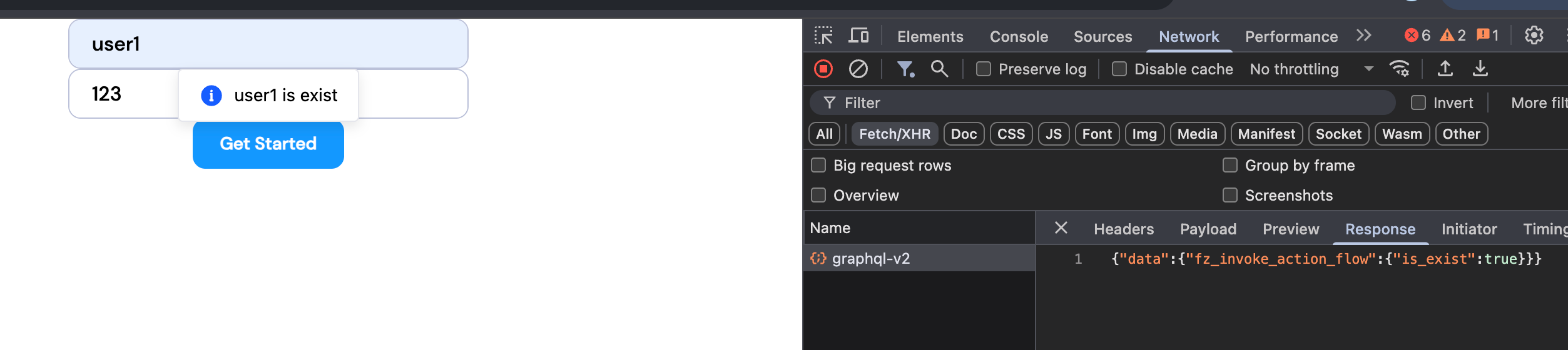 You can use an actionflow to check whether an account with a given username already exists, and then return a boolean value. Based on the actionflow’s result, you can decide what action to take. I created a demo in the check_account page of this project for your reference. MOMEN | Build web apps without code